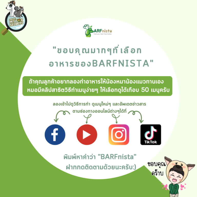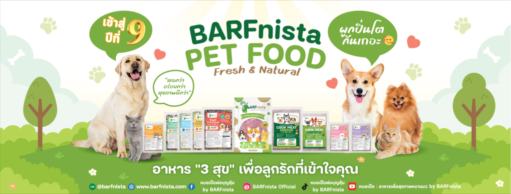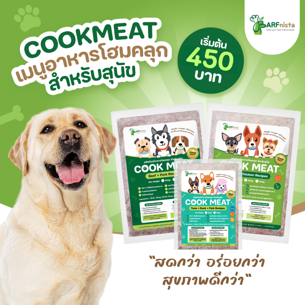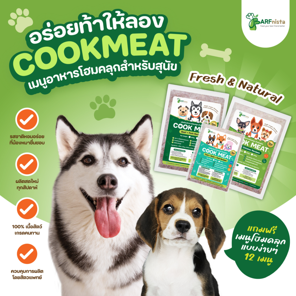 *เพราะพวกเค้าไม่ใช่แค่สัตว์เลี้ยง แต่เป็นสมาชิก”คนสำคัญ”ของครอบครัวปณิธานของ BARFnista คือการส่งมอบอาหารมื้อพิเศษให้ทุกมื้อที่ทานเปี่ยมด้วย”ความสุข”และเพื่อสุขภาพที่ดีใน “ระยะยาว”ไว้วางใจในอาหารของเราได้เลยครับ.-คัดสรรวัตถุดิบเกรดพรีเมี่ยม เลือกใช้ผักปลอดสาร และใช้เนื้อสัตว์เกรดคนทาน 100% รวมทั้งใส่วิตามินนำเข้าจากต่างประเทศ-รับประกันความสดใหม่ เพราะผลิตใหม่ทุกสัปดาห์ ไม่สต็อคนาน ไม่ใส่สารกันบูด ไม่มีสีและแต่งกลิ่นสั่งเคราะห์-มีผลิตภัณฑ์อาหารสัตว์ให้เลือกหลายแบบ สำหรับหมุนเวียน ทานได้ไม่มีเบื่อ ตอบโจทย์ความต้องการของสุนัข-อาหารทุกสูตร หมอควบคุมการผลิตด้วยตัวเองทุกขั้นตอน รวมถึงจัดเรียงสินค้าเองกับมือ ไว้วางใจคุณภาพได้เลย อาหารโฮมคลุกสำหรับสุนัข “COOKMEAT For Dogs” คืออาหารที่ผ่านการปรุงสุกมาแล้ว (เฉพาะส่วนที่เป็นเนื้อสัตว์)ใช้ 100% เนื้อสัตว์เกรดคนทาน ผลิตสดใหม่ทุกสัปดาห์ ไม่ใส่สารกันบูด ไม่ใส่สีและแต่งกลิ่นสังเคราะห์เมื่อนำมาละลายหรือเวฟ 1-2 นาทีก็พร้อมเสริฟให้น้องหมาทานได้ทันทีใน 1 ถุง จะประกอบด้วยเนื้อสัตว์ 90 % และเครื่องใน 10 % มี 2 สูตรให้เลือก ได้แก่1) PORK+CHICKEN RECIPES : เนื้อหมู+สันในไก่+หัวใจไก่+ตับไก่+วิตามินและแร่ธาตุสูตรเฉพาะ2) BEEF+PORK RECIPES : เนื้อวัว+เนื้อหมู+หัวใจวัว+ผ้าขี้ริ้ววัว+ตับวัว+วิตามินและแร่ธาตุสูตรเฉพาะ2) TUNA+PORK RECIPES : เนื้อทูน่า+เนื้อหมู+เครื่องในรวมเป็ด+วิตามินและแร่ธาตุสูตรเฉพาะ (บรรจุใส่ถุงซีลสูญญากาศ 2 ขนาด แบบ 200 กรัม ราคา 80 บาท และ 400 กรัม ราคา 140 บาท) มีวิธีการให้ 4 แบบ : ทานแบบเนื้อล้วน / เนื้อผสมซุป / ปรุงเองต่อตาม 12 เมนู หรือจะโรยเป็นท็อปปิ้งบนอาหารเม็ดก็ได้ **เพื่อประโยชน์ทางสุขภาพ เจ้าของจำเป็นต้องนำ Cookmeat ไปทำเมนูโฮมคลุกต่อด้วยตัวเอง ตามสูตรตัวอย่างที่หมอเป็ดสาธิตไว้ (มีทั้งหมด 12 เมนู)เพราะการได้รับสารอาหารครบหมู่จากเนื้อสัตว์ ผักผลไม้ ข้าว อาหารเสริม เช่น น้ำมันมะพร้าวสกัดเย็นและกรีกโยเกิร์ต นอกจากทำให้ขับถ่ายคล่องขึ้นยังได้รับโปรตีน ไฟเบอร์ แคลเซียม โพแทสเซียม ฟอสฟอรัส ฯลฯ ควรให้ทานคู่กับน้ำซุปสุขภาพ Bone Broth เพื่อป้องกันการขาดวิตามินและแร่ธาตุถ้าทำอาหารโฮมคลุก โดยใช้วัตถุดิบที่ดีและมีสัดส่วนโภชนาการถูกต้อง ก็ดีต่อสุขภาพมากกว่าที่คิดน้องหมาปลื้มกินหมดชาม เจ้าของยังชื่นใจที่เห็นเค้าสุขภาพดี ด้วยอาหารฝีมือเราอีกด้วยนะ^^อาหารจัดเก็บในช่องฟรีซได้นานถึง 4 เดือน จัดเก็บในช่องเย็น ได้เพียง 2-3 วันแนะนำว่าควรแพลนสั่งซื้ออาหารให้น้องหมาทานหมดภายใน 1 เดือน เพื่อความสดใหม่และการคงคุณค่าของวิตามินและแร